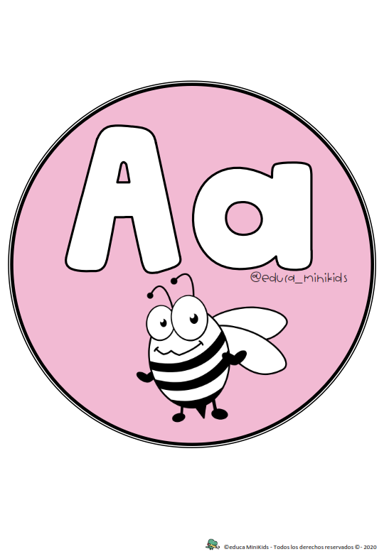 Plantillas en círculo con las letras del abecedario tanto en mayúscula como en minúscula. Contiene una imagen que comienza por la letra indicada en el círculo.